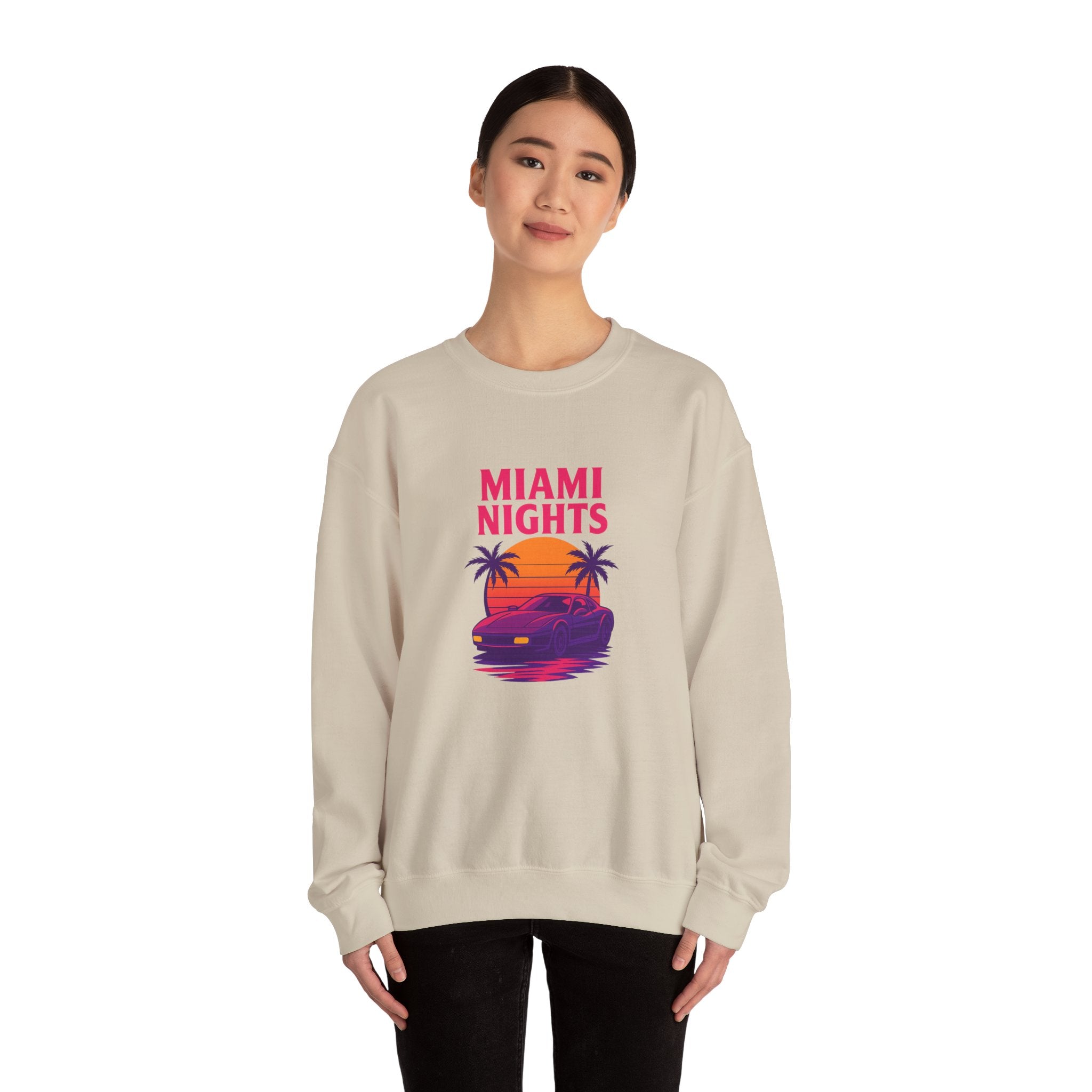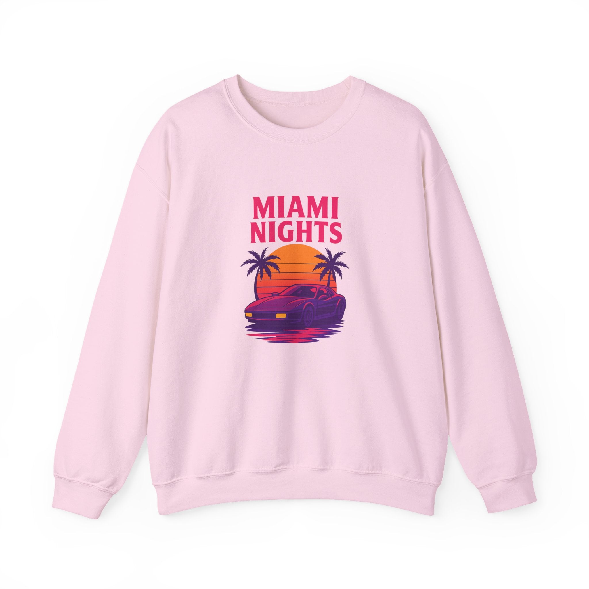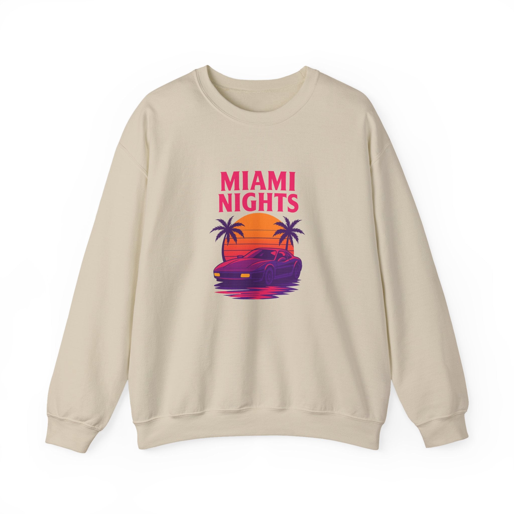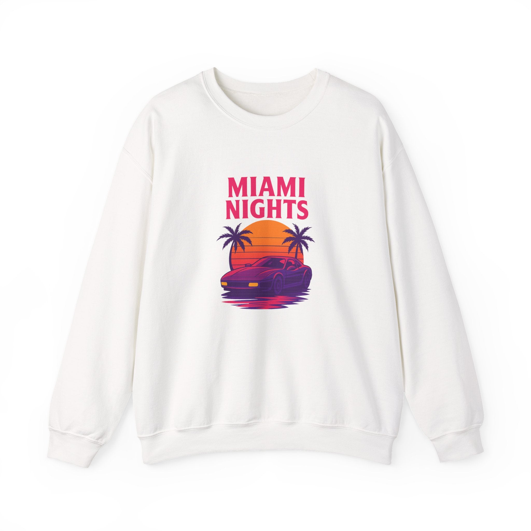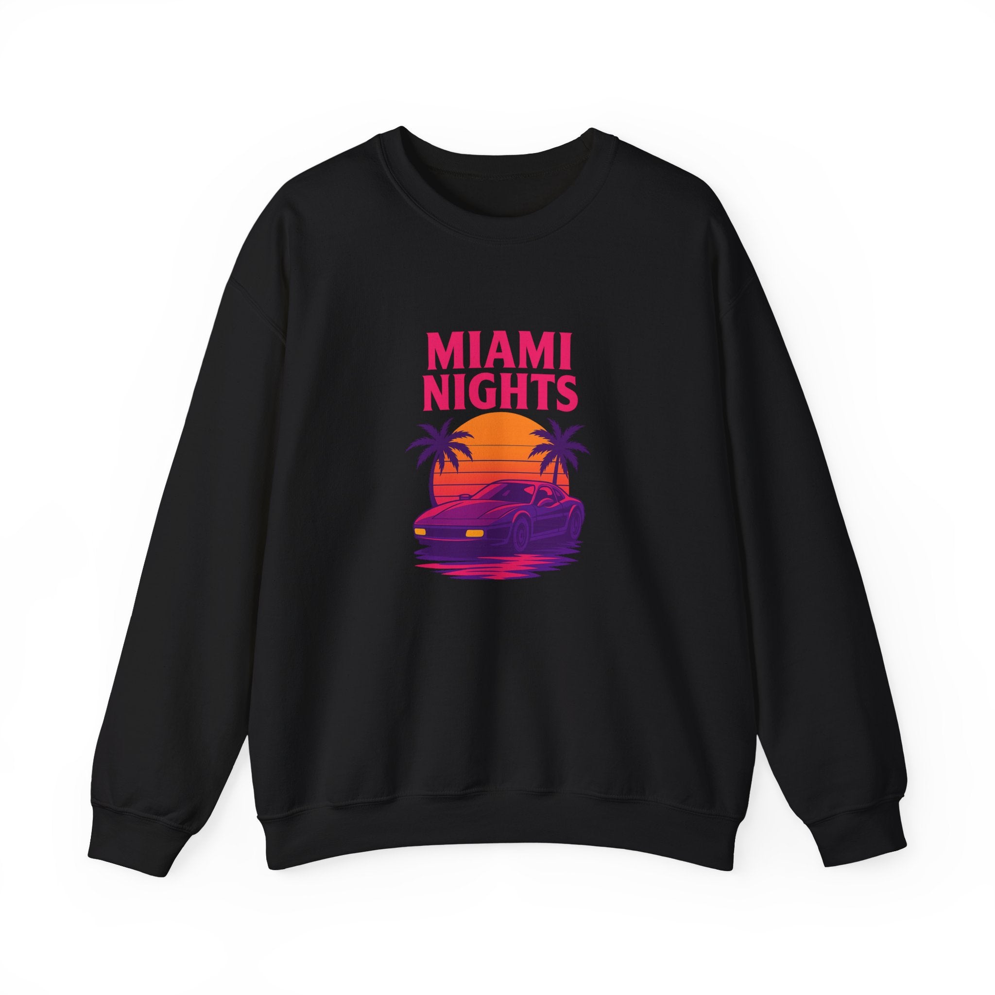 Feel the neon glow of late-night drives and ocean air with this retro-inspired crewneck. Soft yet sturdy, it wears in like a favorite memory—warmth at the wrist, relaxed through the body. A sunset-drenched sports car and palm silhouettes on the front channel vintage Miami vibes. The back’s colorful “wanted” lettering and star row add playful attitude without shouting. Slip it on for cool evenings, city cruising, or when you want your outfit to do the storytelling for you.