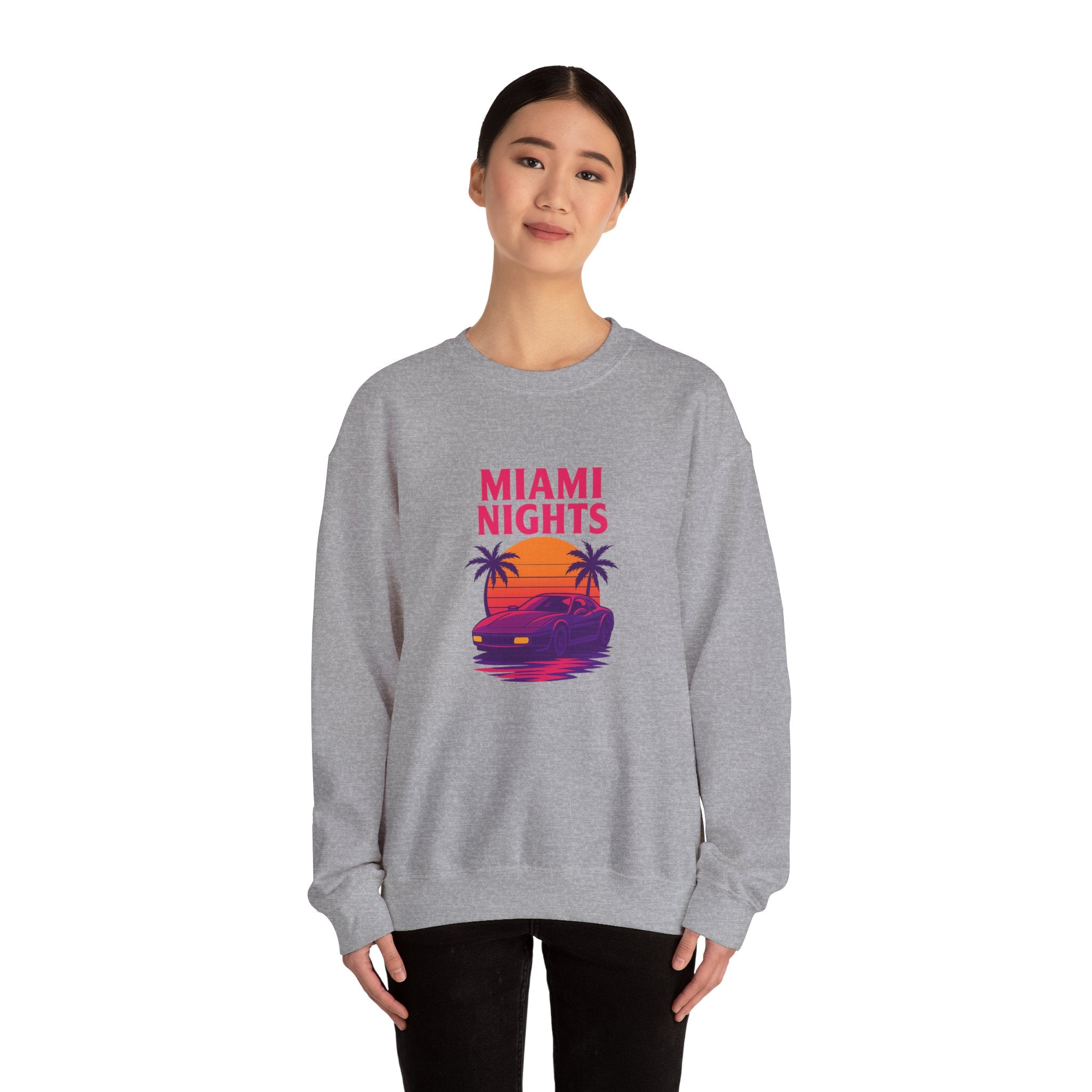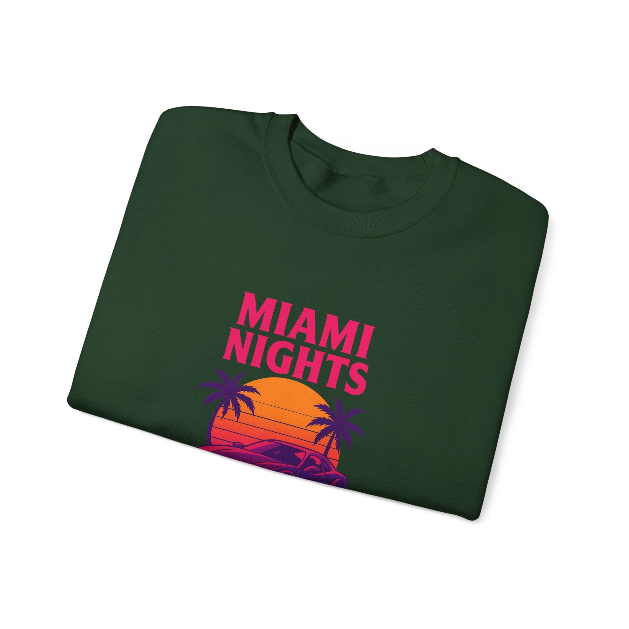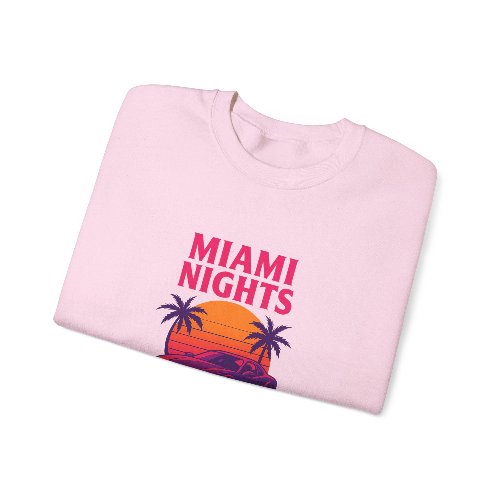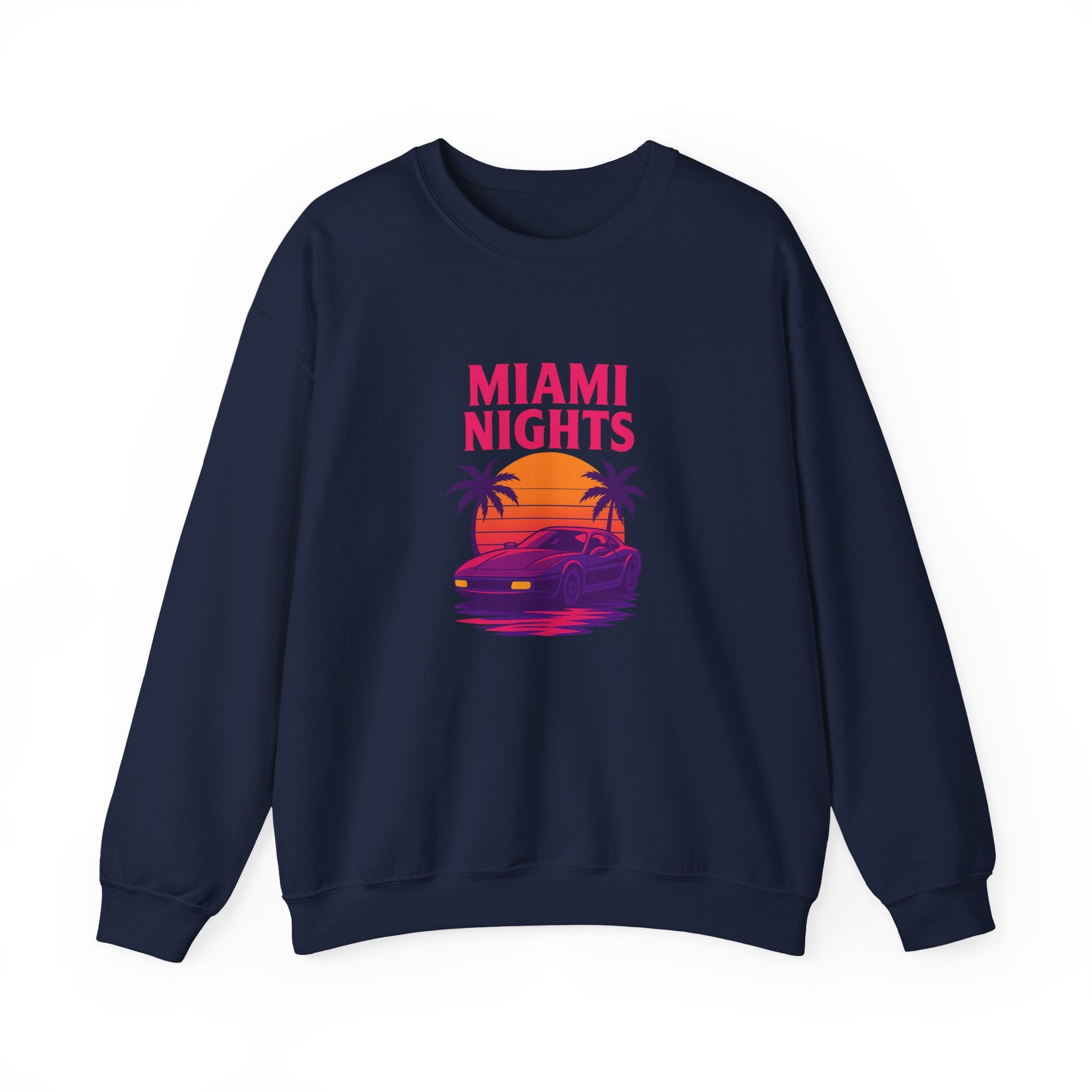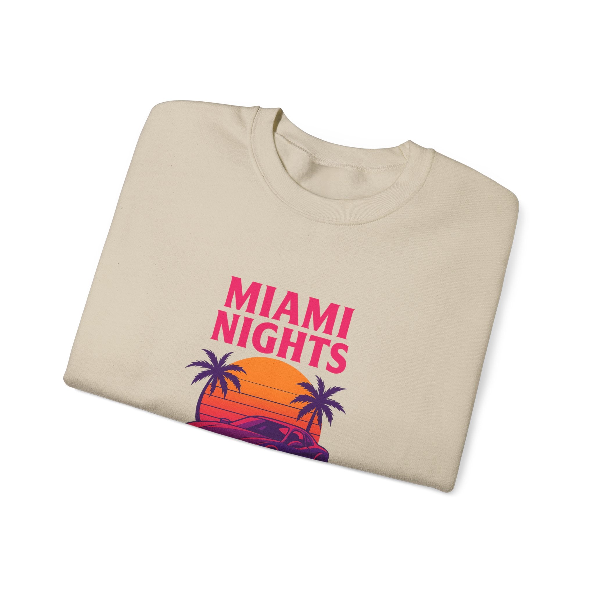 Feel the neon glow of late-night drives and ocean air with this retro-inspired crewneck. Soft yet sturdy, it wears in like a favorite memory—warmth at the wrist, relaxed through the body. A sunset-drenched sports car and palm silhouettes on the front channel vintage Miami vibes. The back’s colorful “wanted” lettering and star row add playful attitude without shouting. Slip it on for cool evenings, city cruising, or when you want your outfit to do the storytelling for you.