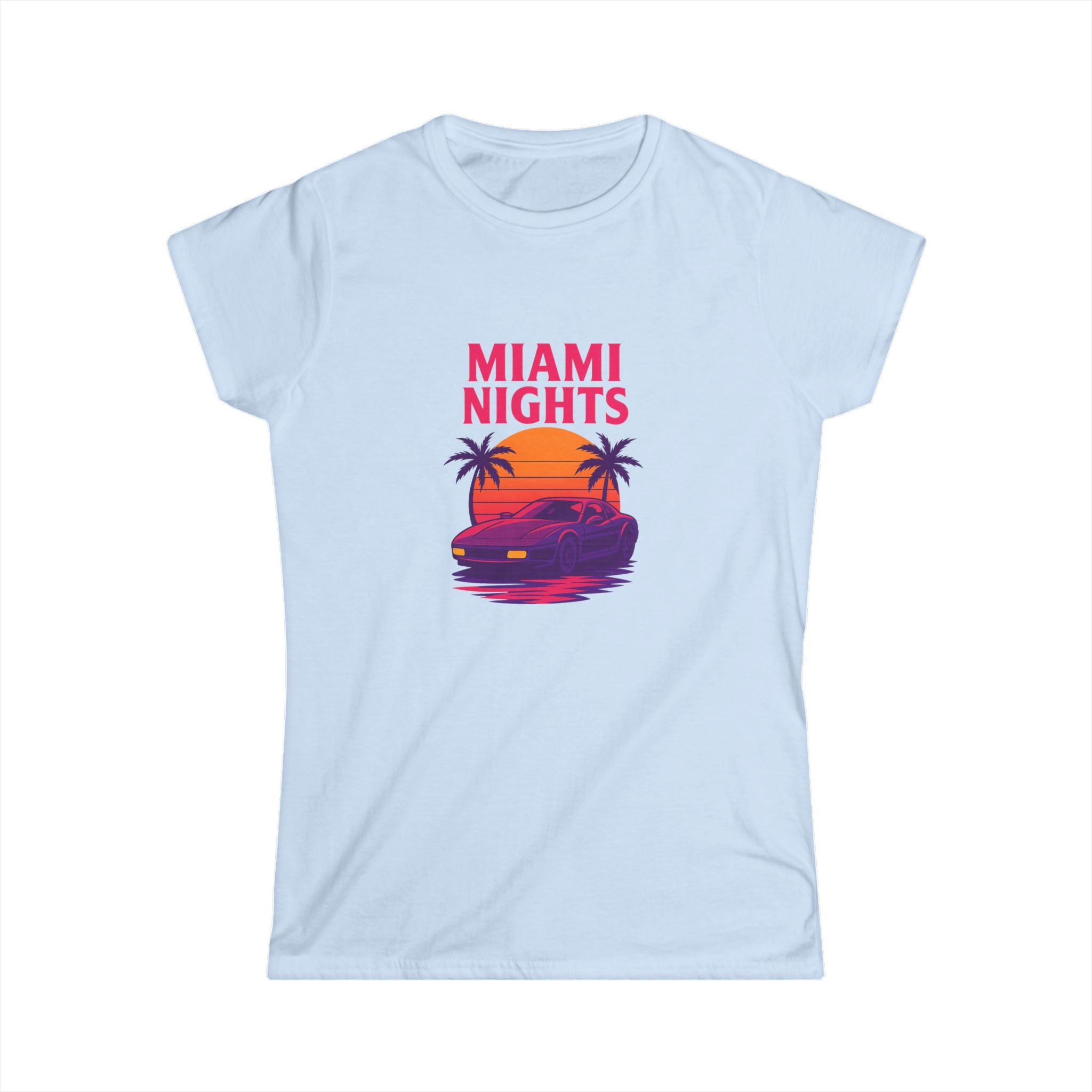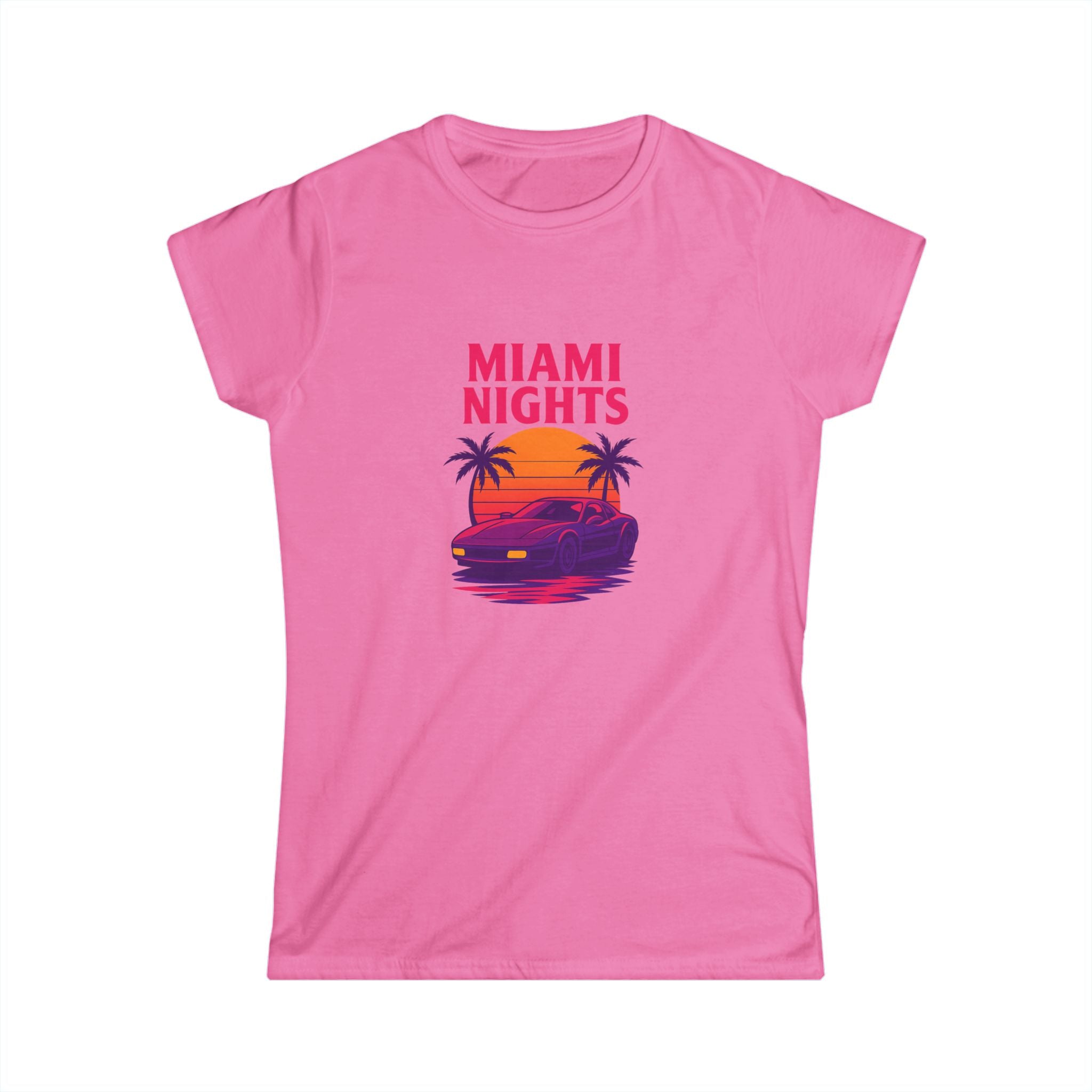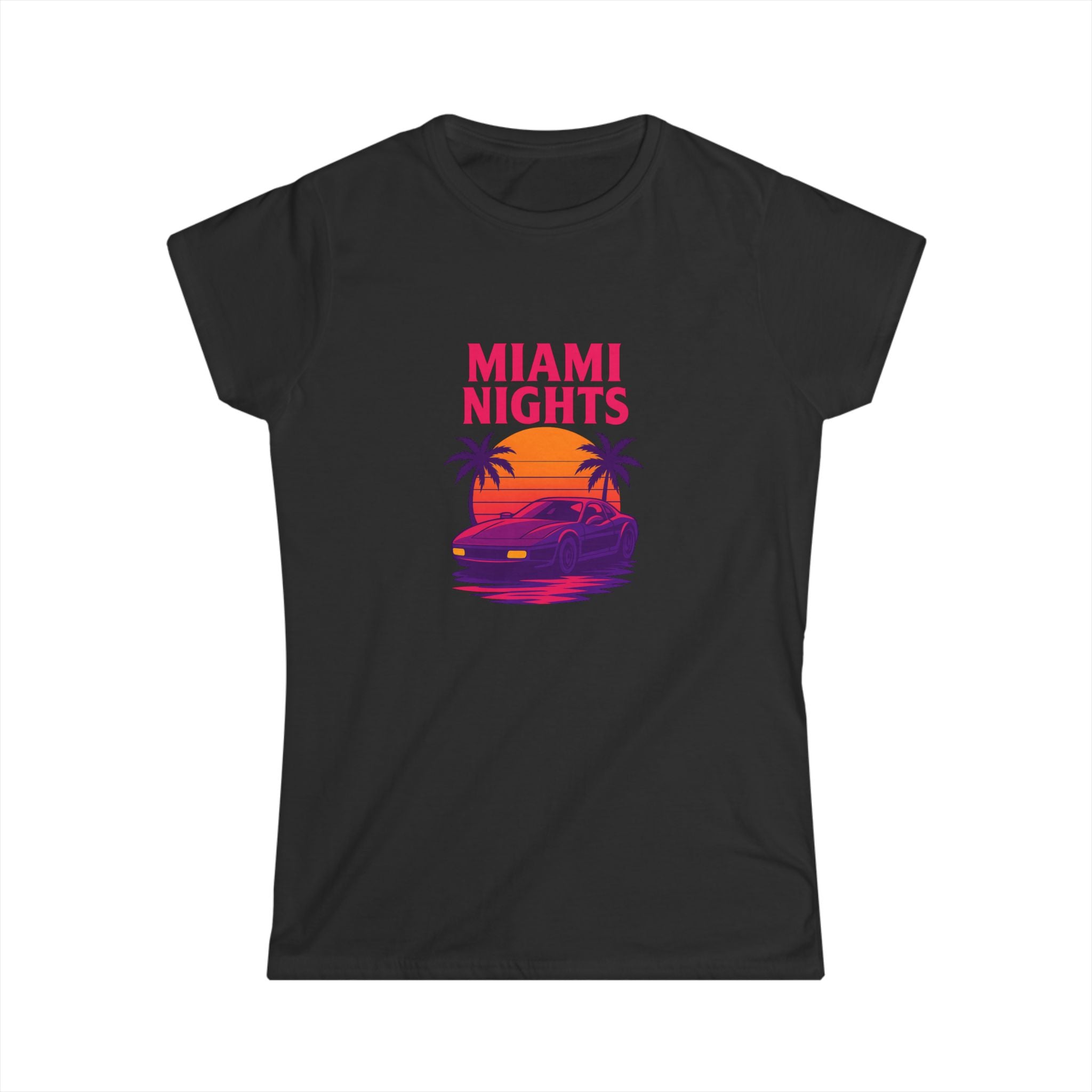 Feel the neon hum of shoreline nights in this lightweight tee. A sun-dipped sports car glides beneath palm silhouettes while bold, retro lettering announces "MIAMI NIGHTS" up front—vivid magentas and sunset oranges that catch the eye without shouting. The back adds a playful, colorful "wanted" logo with star accents, giving the shirt a cheeky, streetwise edge. Semi-fitted and soft to the touch, it layers easily under jackets or stands alone with high-waist jeans for an effortlessly nostalgic look. Wear it when the city lights come alive, on drives down Ocean Drive, or anytime you want to summon that warm, salt-tinged evening energy.