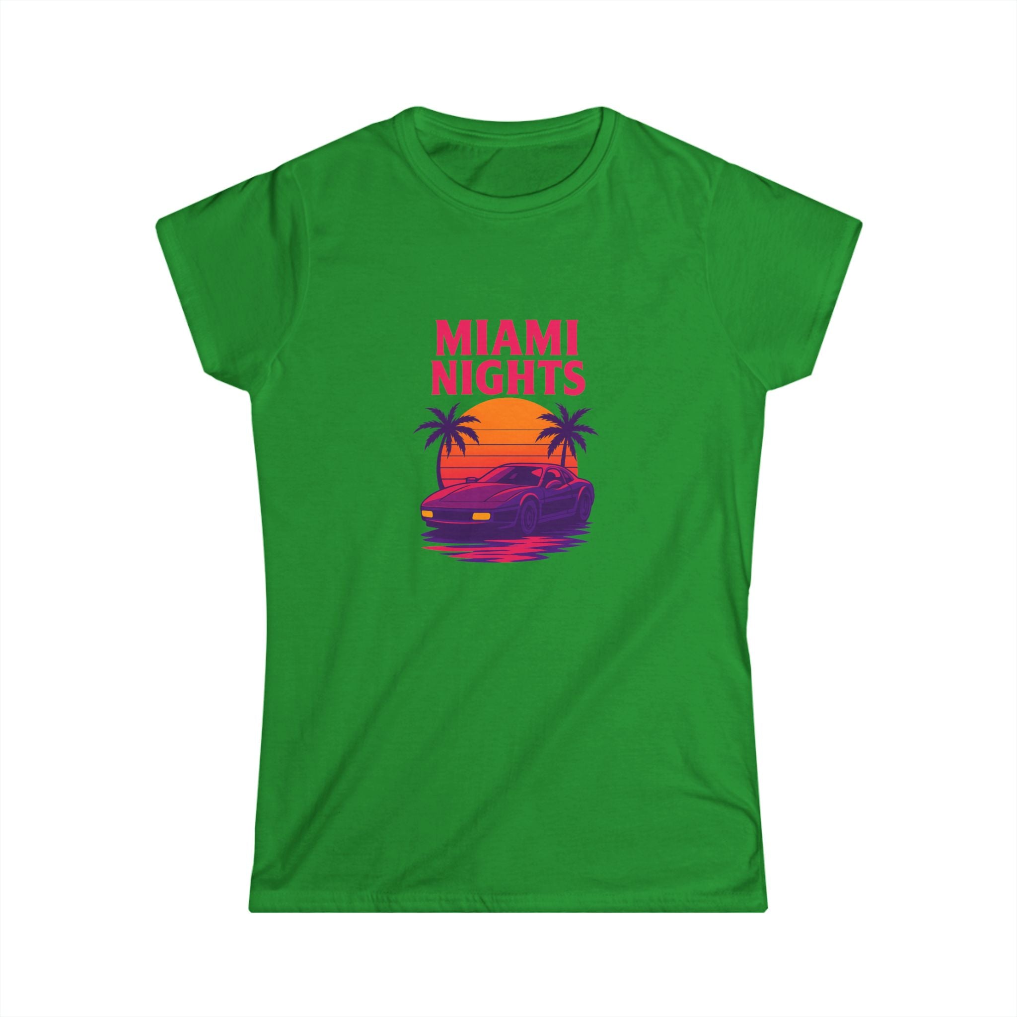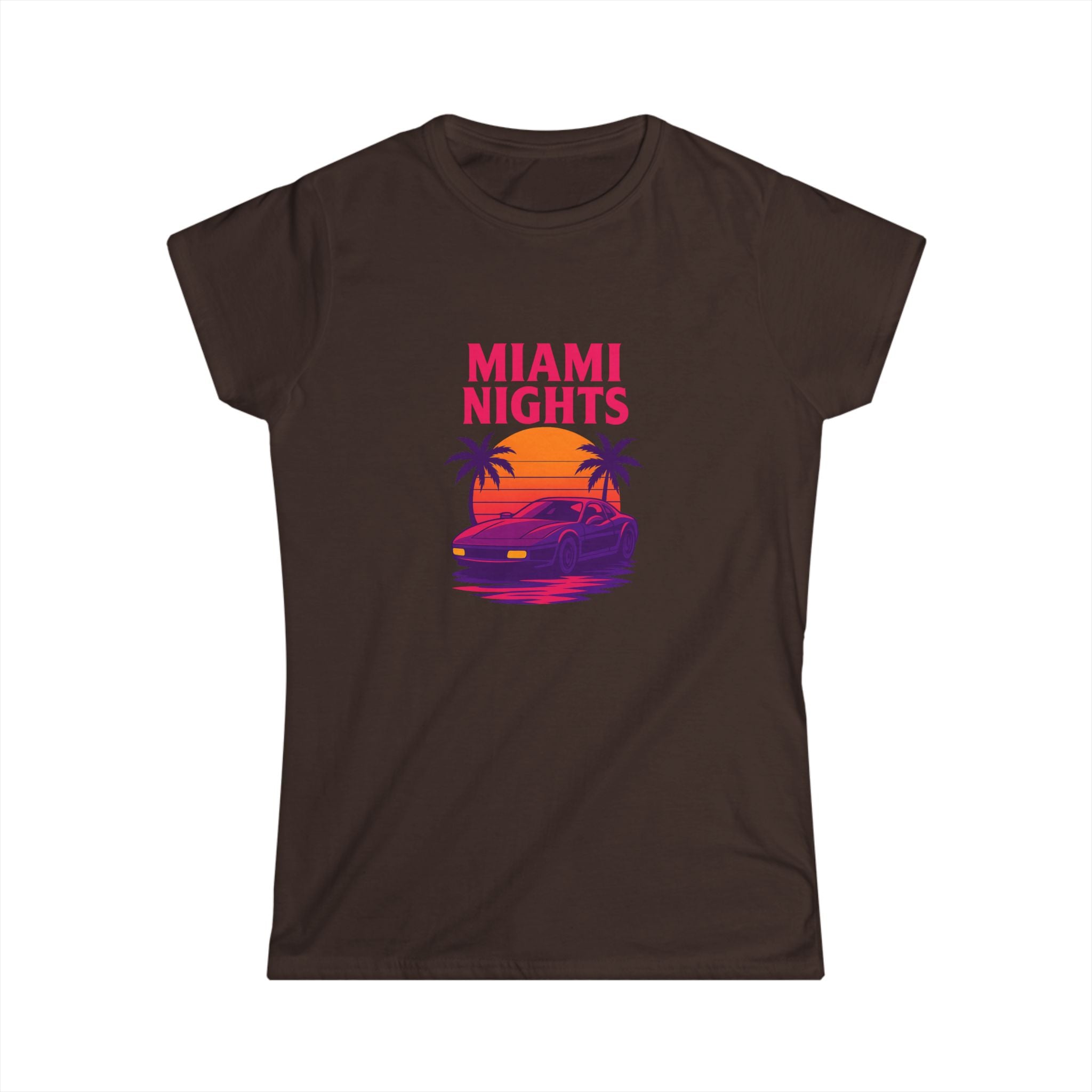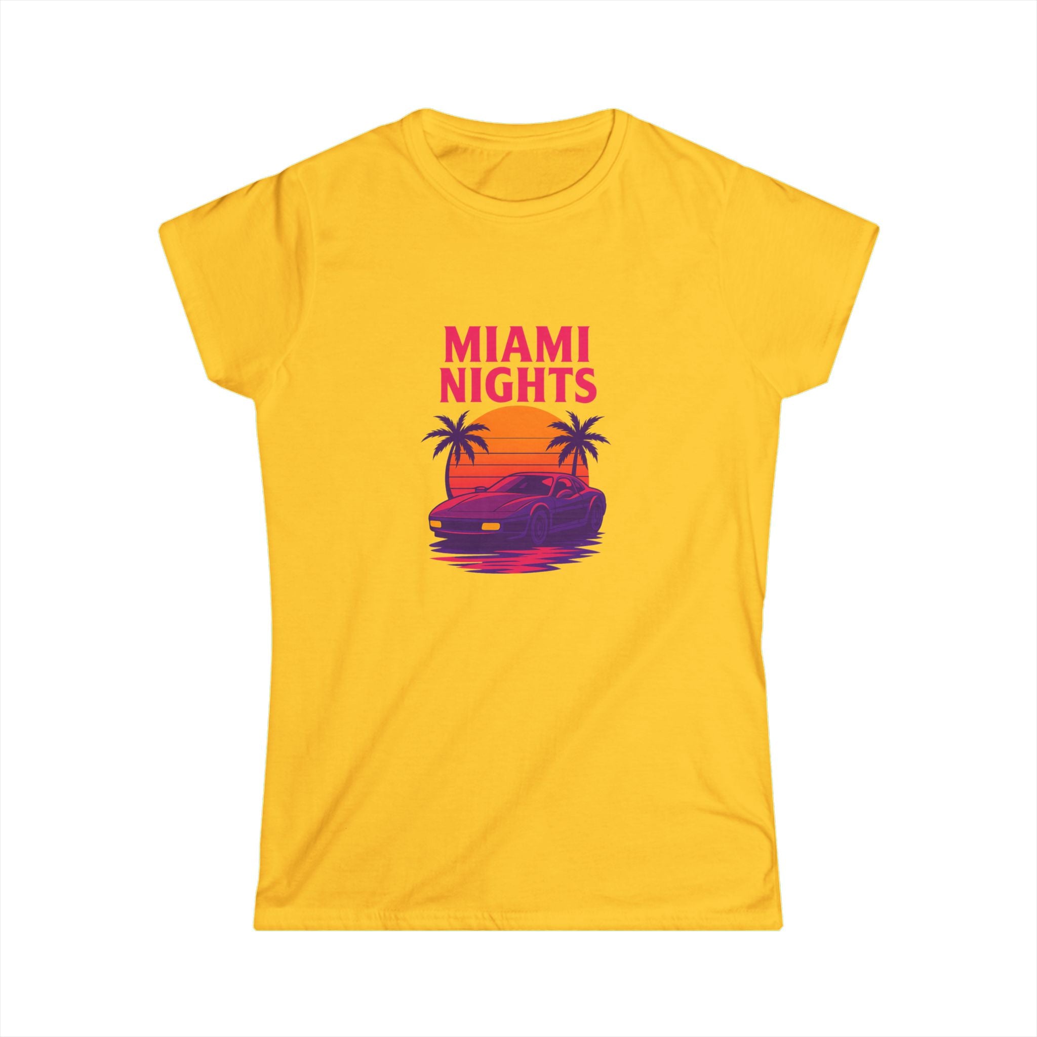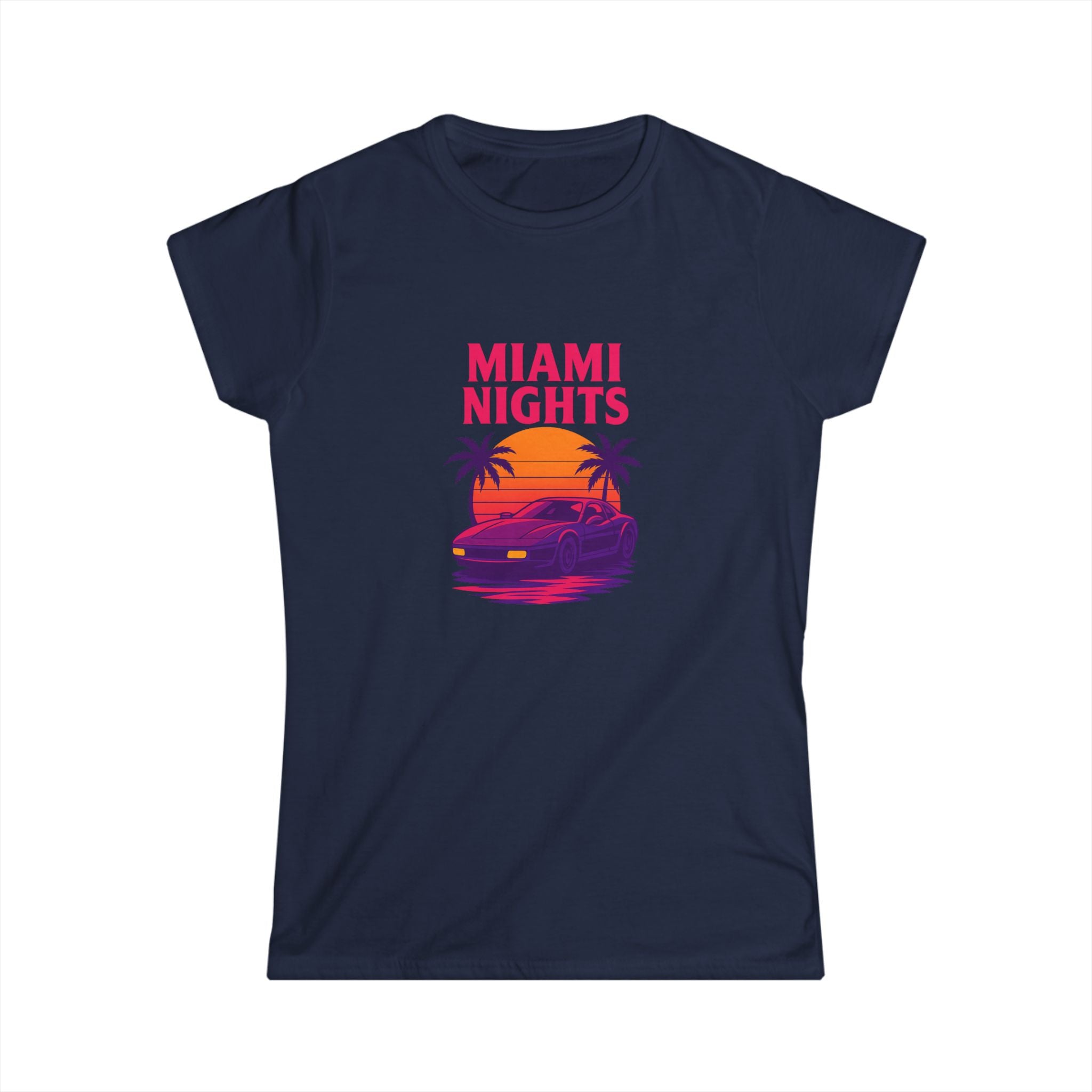 Feel the neon hum of shoreline nights in this lightweight tee. A sun-dipped sports car glides beneath palm silhouettes while bold, retro lettering announces "MIAMI NIGHTS" up front—vivid magentas and sunset oranges that catch the eye without shouting. The back adds a playful, colorful "wanted" logo with star accents, giving the shirt a cheeky, streetwise edge. Semi-fitted and soft to the touch, it layers easily under jackets or stands alone with high-waist jeans for an effortlessly nostalgic look. Wear it when the city lights come alive, on drives down Ocean Drive, or anytime you want to summon that warm, salt-tinged evening energy.