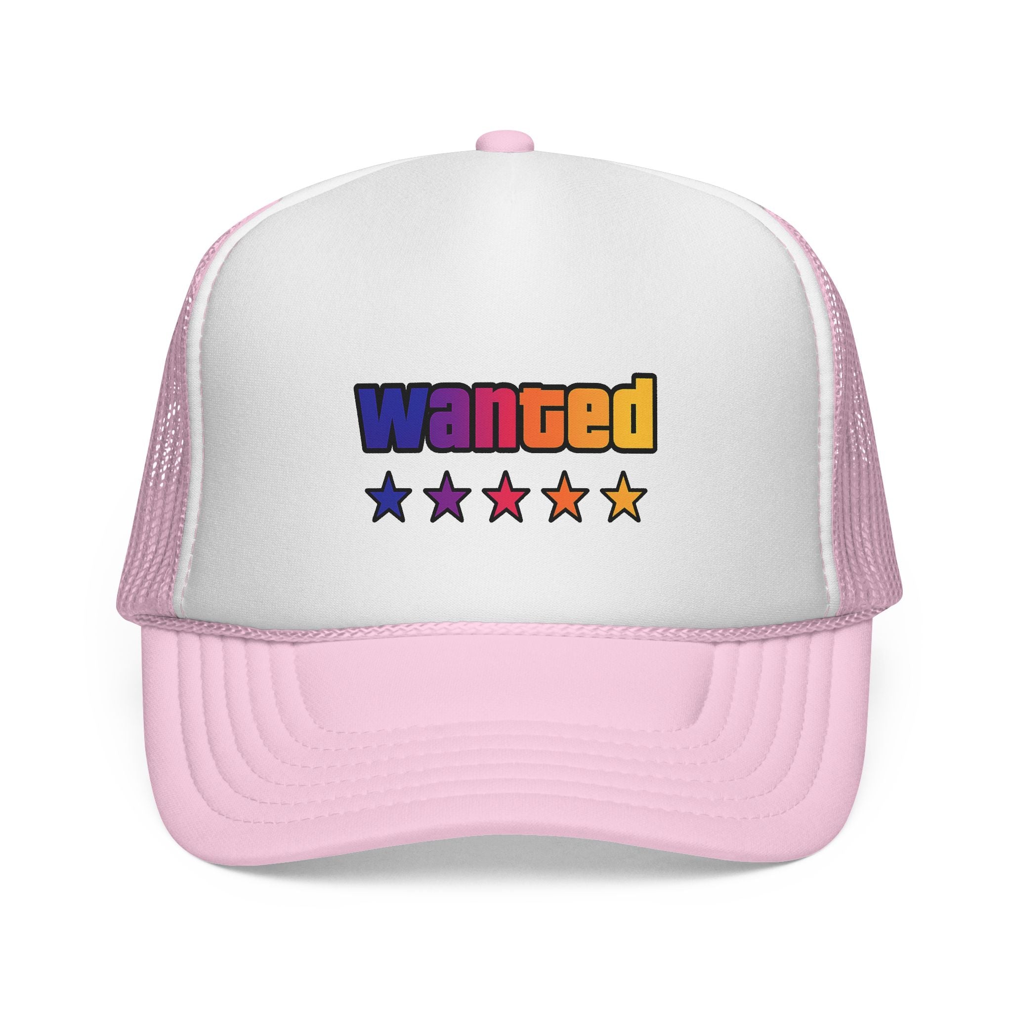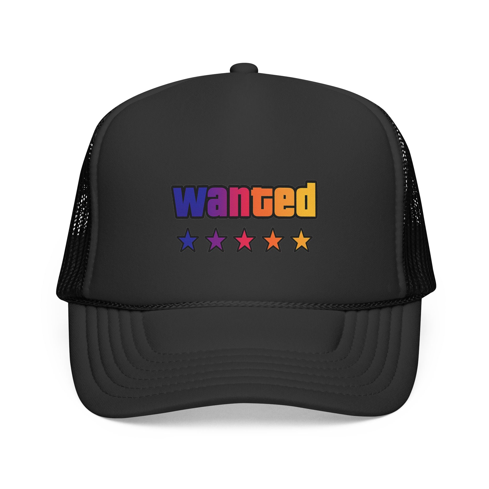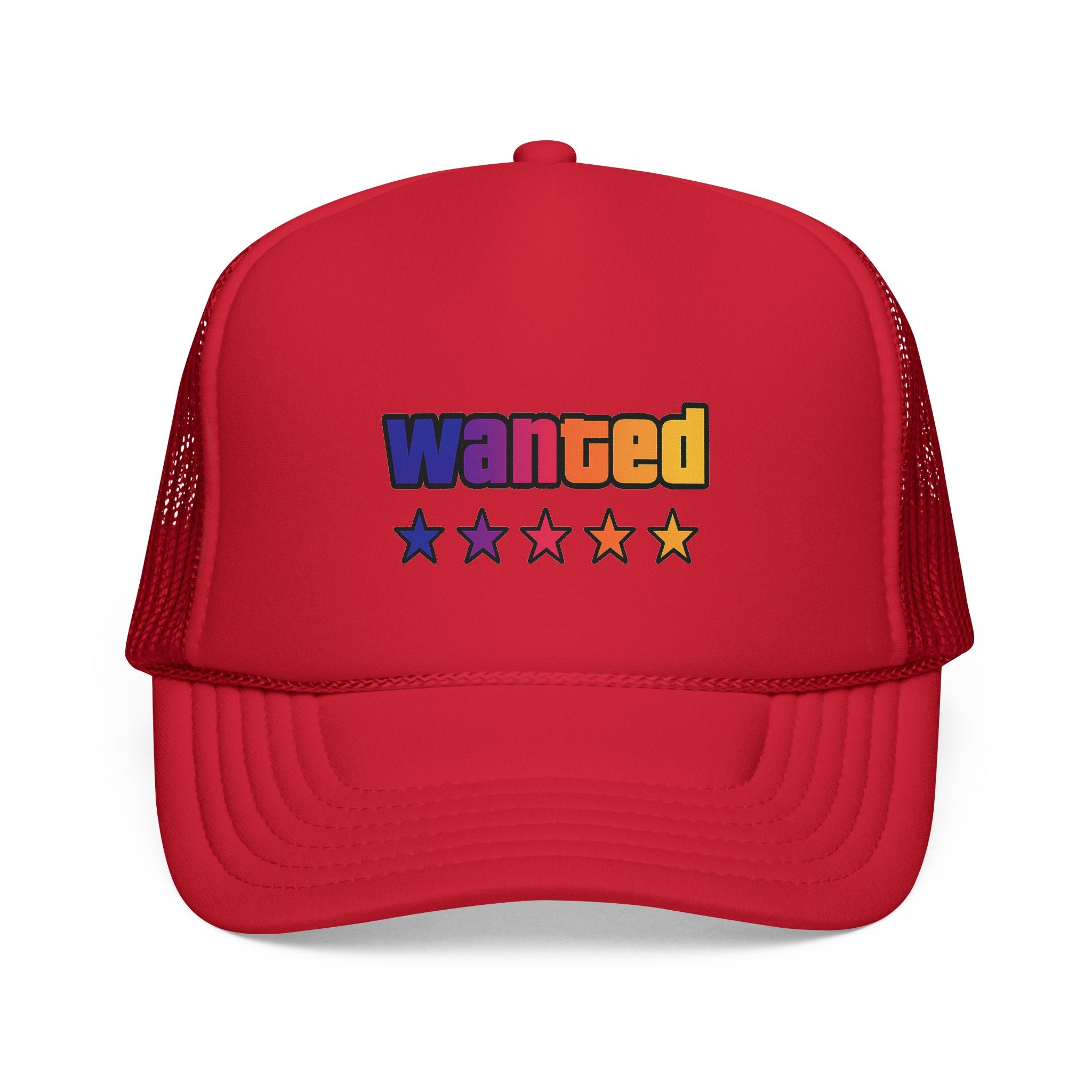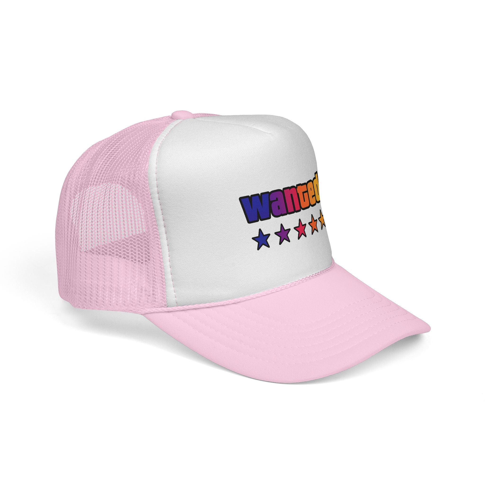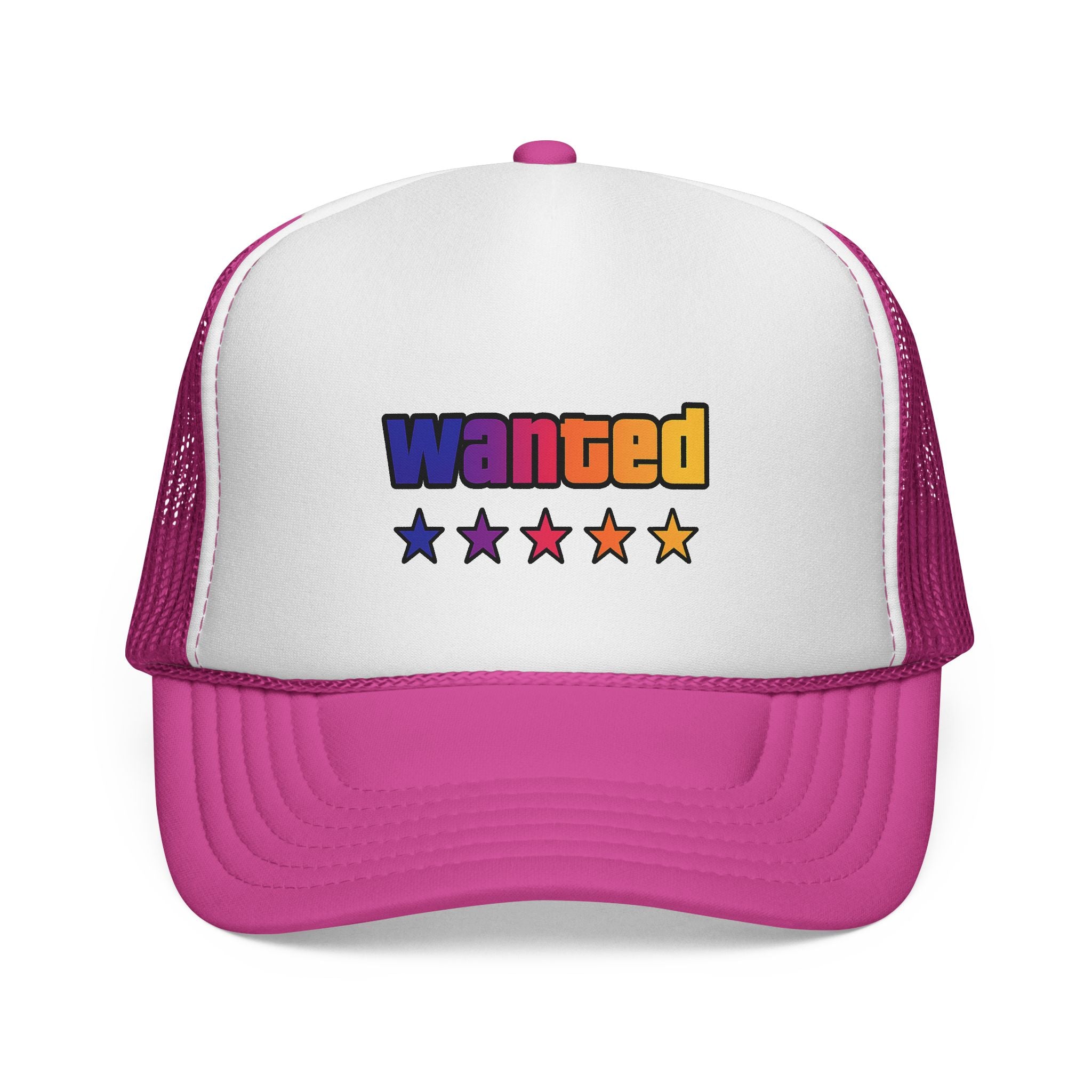 A bright, retro-inspired trucker cap that brings playful color and bold personality to casual days. The foam front showcases a vivid "wanted" patch-style graphic with a rainbow gradient and five stars beneath, while the breathable mesh back keeps you cool on long drives, outdoor chores, or city strolls. The adjustable snap lets you dial in a relaxed fit, and the color-matched details give the cap a polished, cohesive look. Wear it tilted back for a laid-back vibe or pulled low for sun-shielding attitude — this cap reads like someone who loves road trips, neon signs, and collecting small, joy-filled moments.