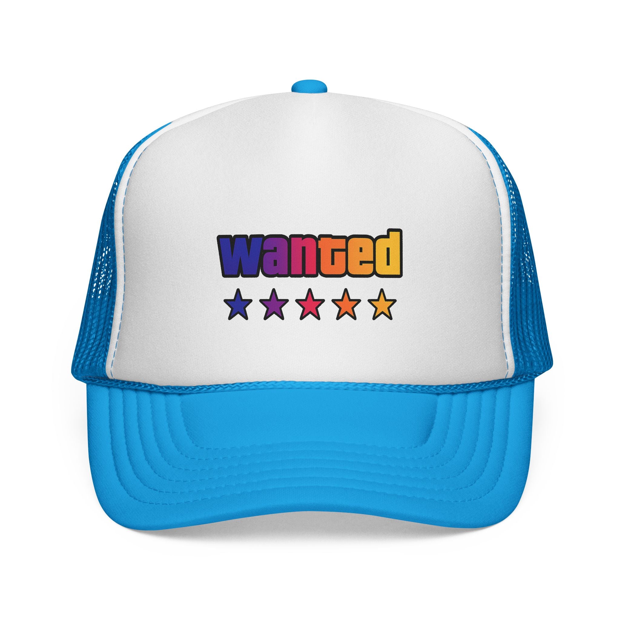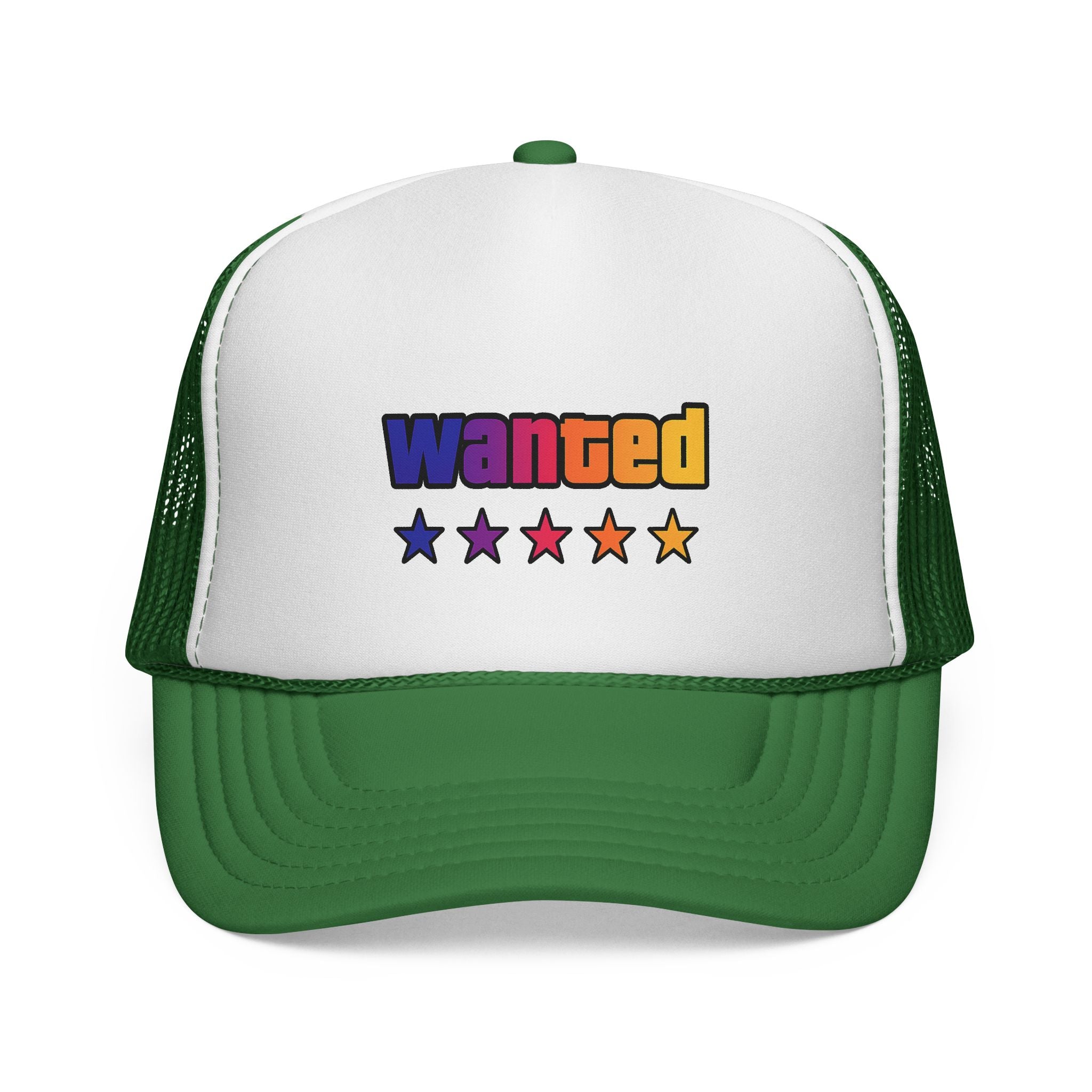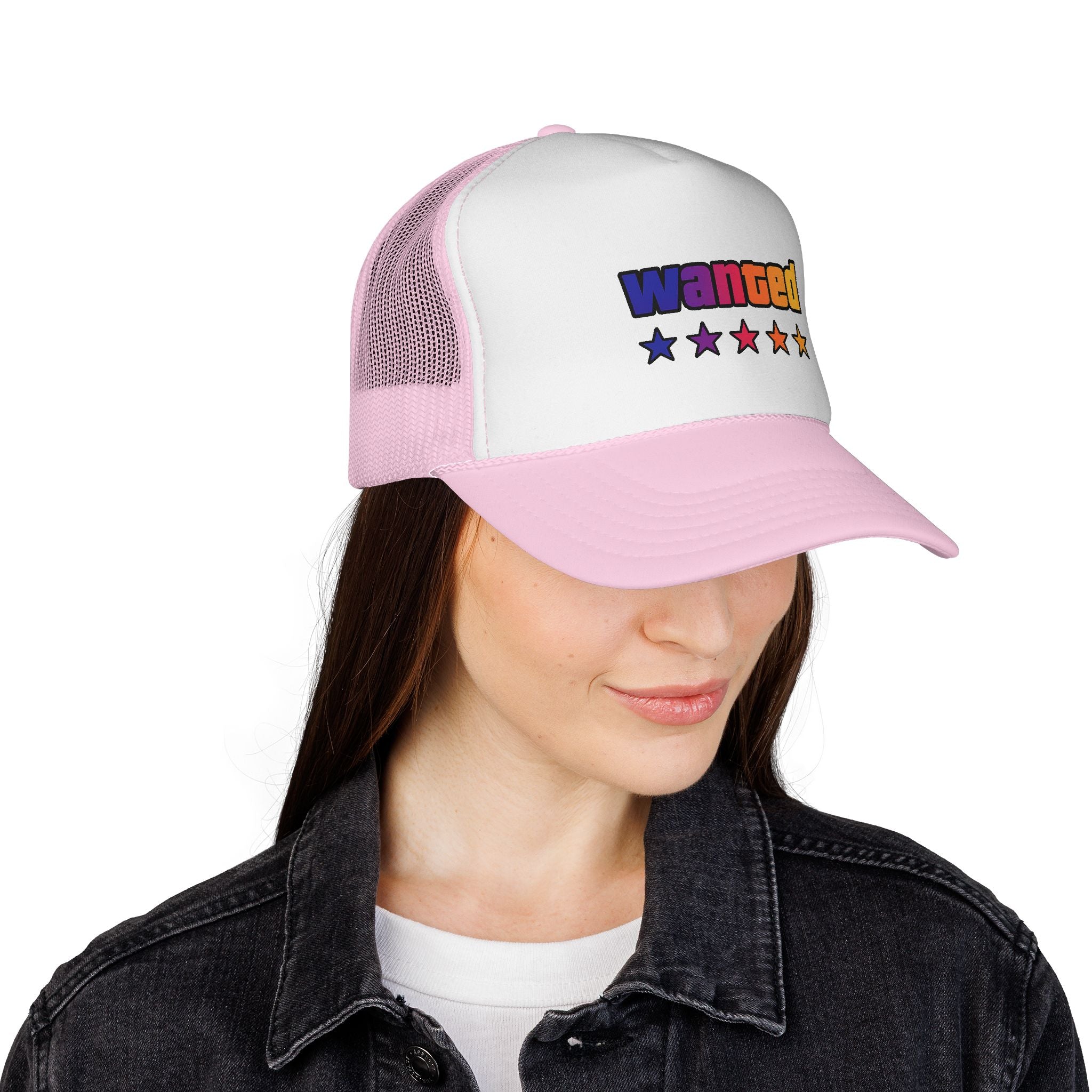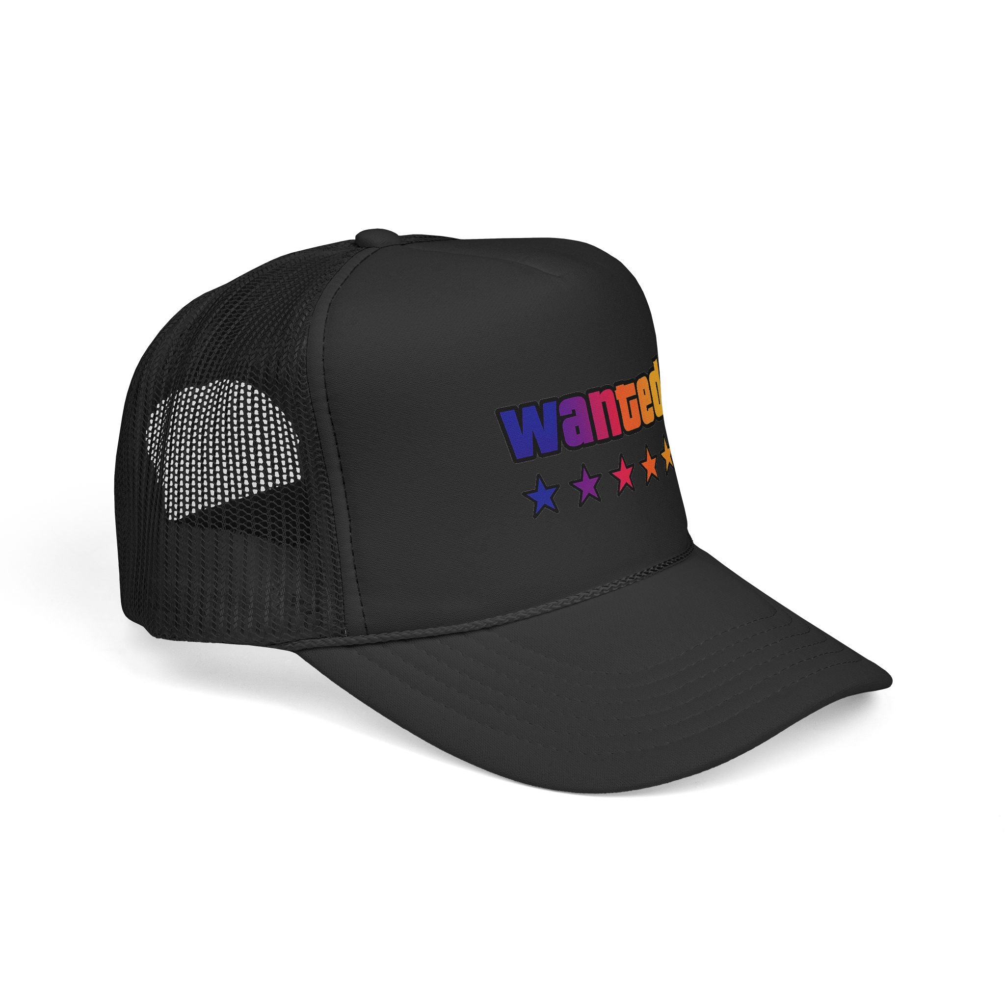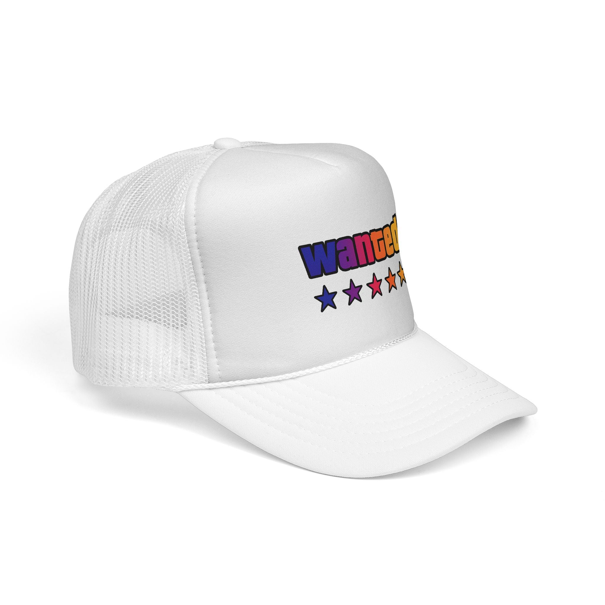 A bright, retro-inspired trucker cap that brings playful color and bold personality to casual days. The foam front showcases a vivid "wanted" patch-style graphic with a rainbow gradient and five stars beneath, while the breathable mesh back keeps you cool on long drives, outdoor chores, or city strolls. The adjustable snap lets you dial in a relaxed fit, and the color-matched details give the cap a polished, cohesive look. Wear it tilted back for a laid-back vibe or pulled low for sun-shielding attitude — this cap reads like someone who loves road trips, neon signs, and collecting small, joy-filled moments.