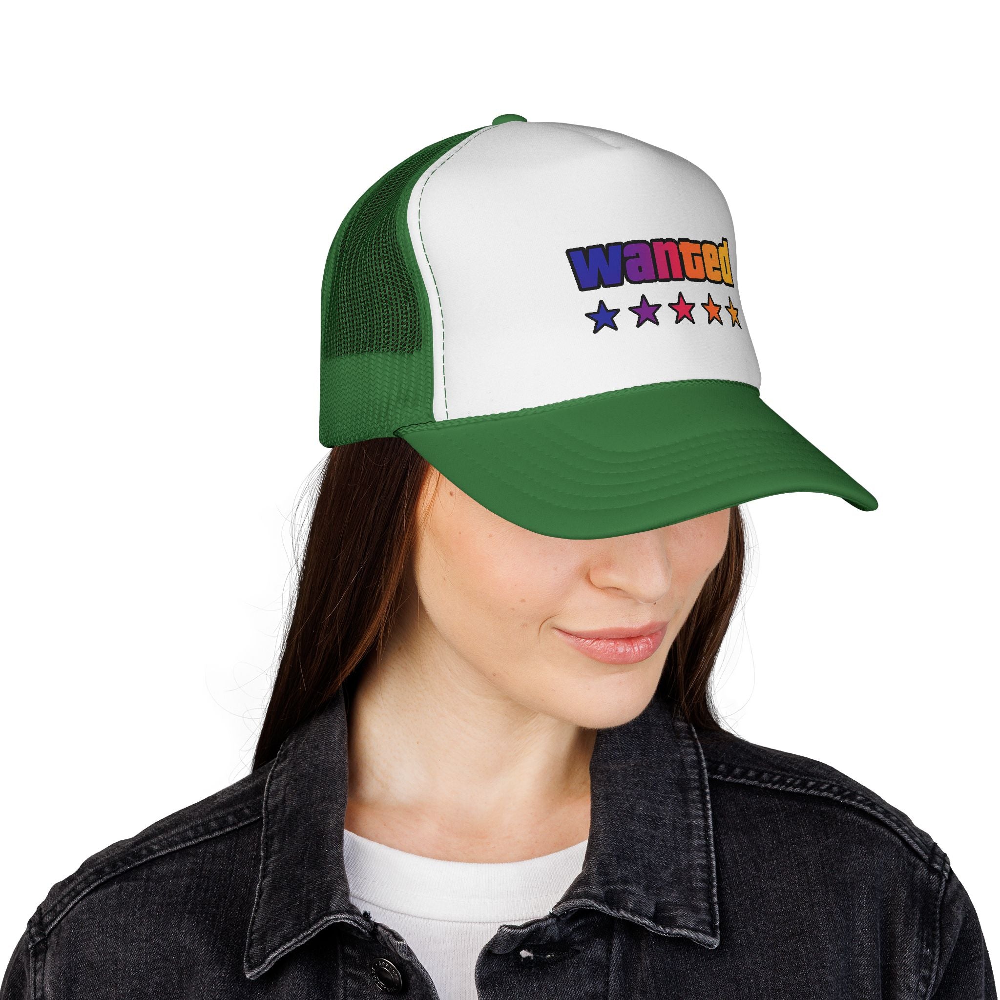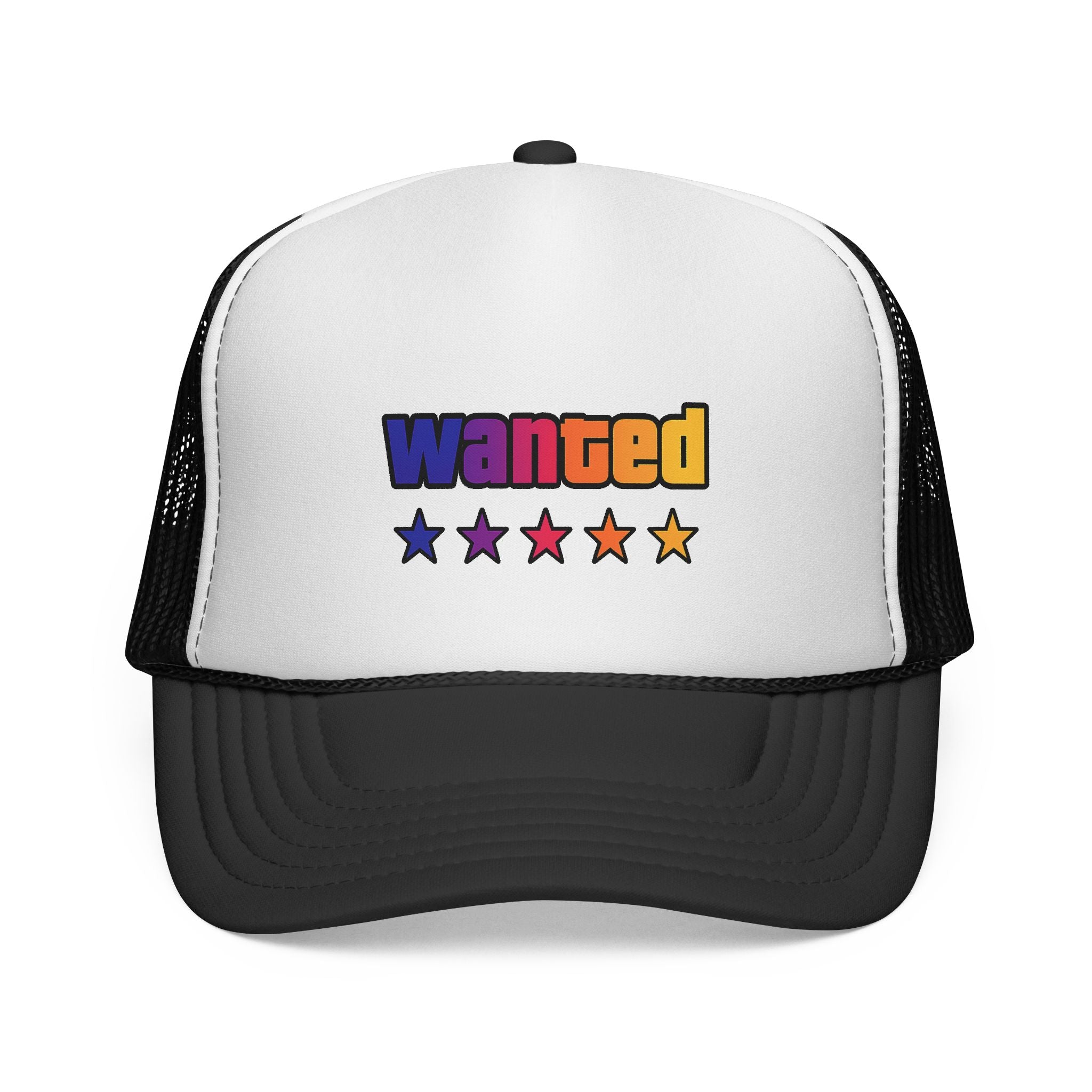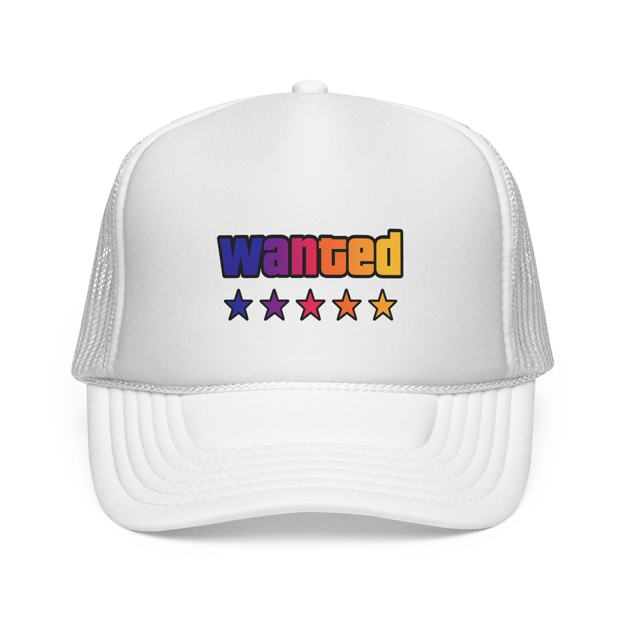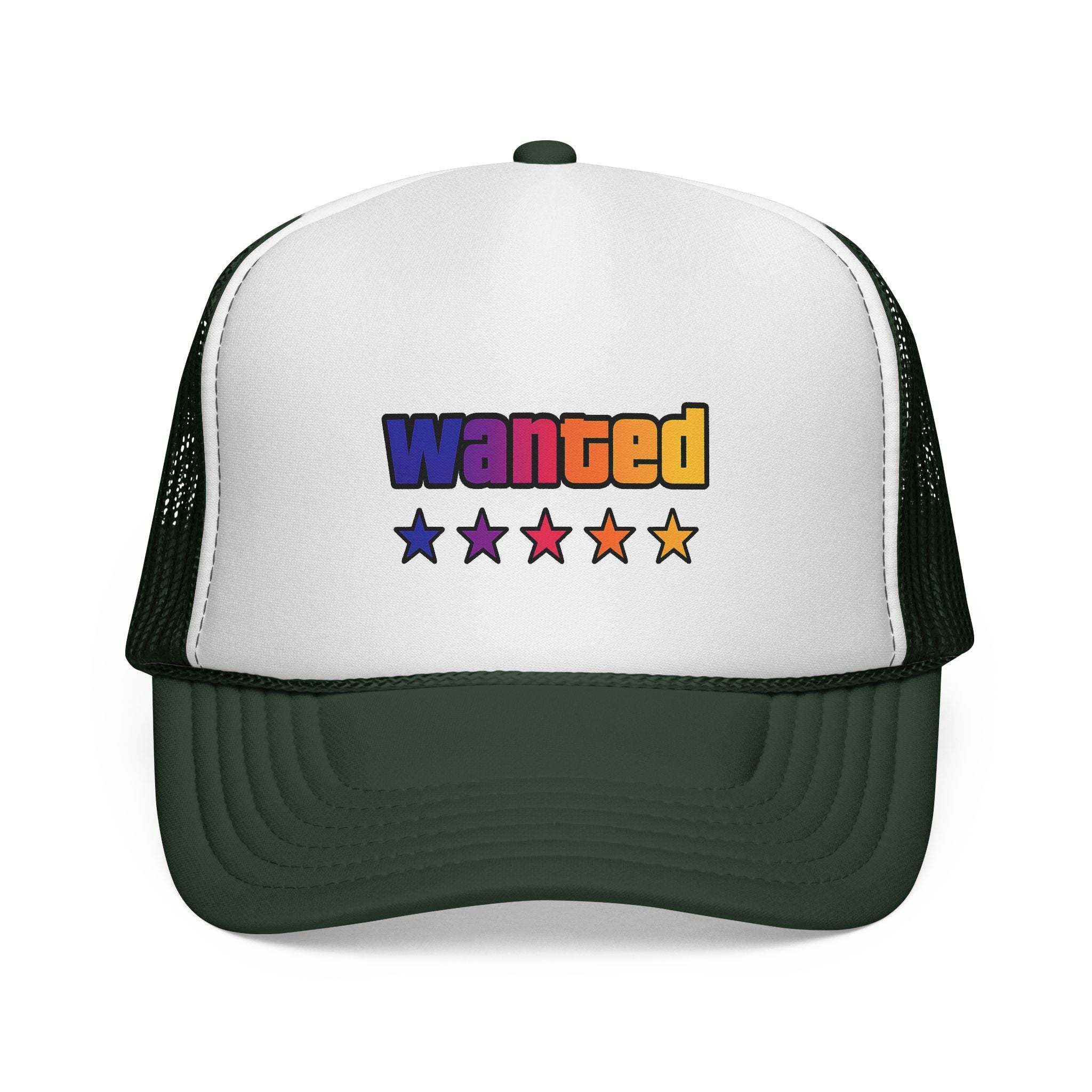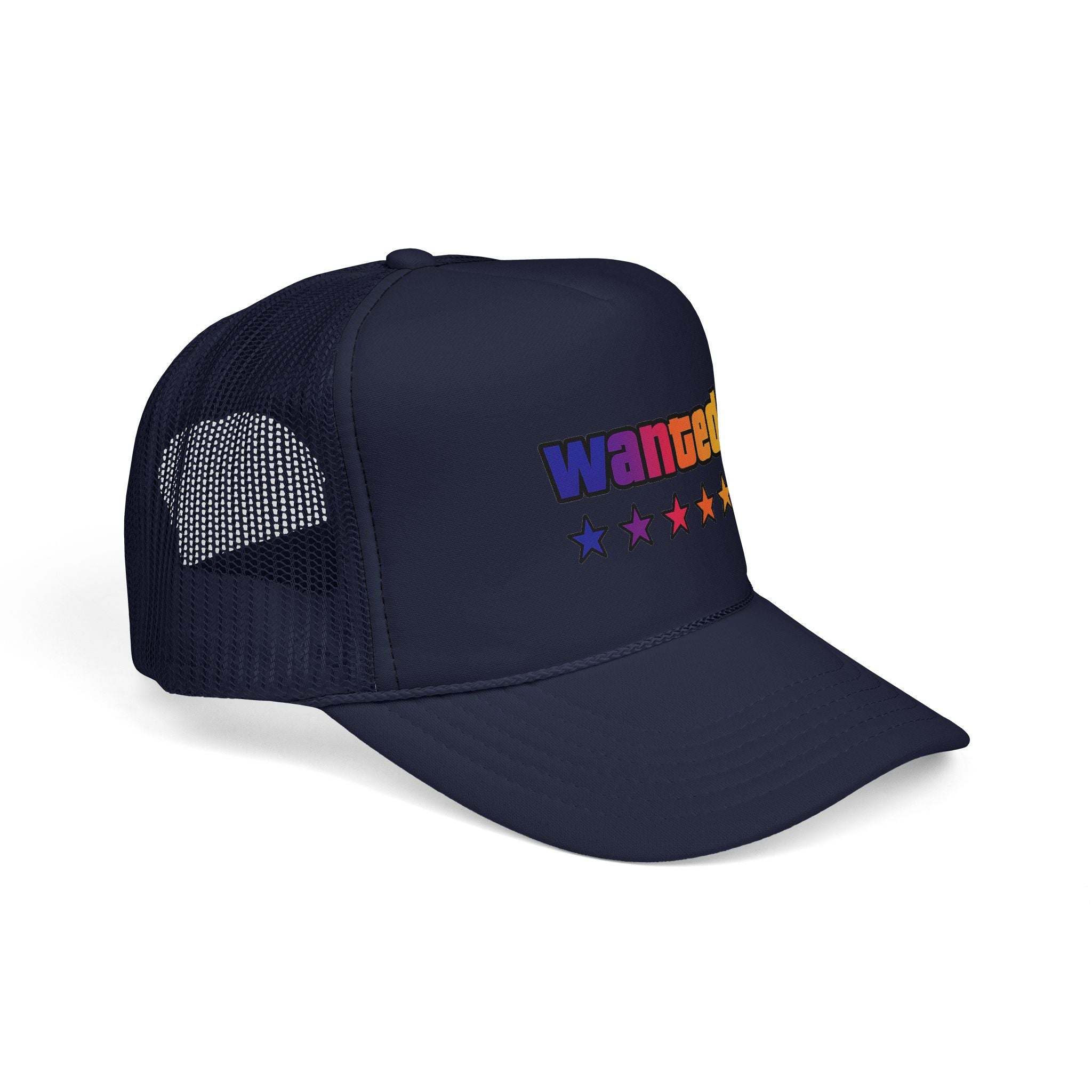A bright, retro-inspired trucker cap that brings playful color and bold personality to casual days. The foam front showcases a vivid "wanted" patch-style graphic with a rainbow gradient and five stars beneath, while the breathable mesh back keeps you cool on long drives, outdoor chores, or city strolls. The adjustable snap lets you dial in a relaxed fit, and the color-matched details give the cap a polished, cohesive look. Wear it tilted back for a laid-back vibe or pulled low for sun-shielding attitude — this cap reads like someone who loves road trips, neon signs, and collecting small, joy-filled moments.